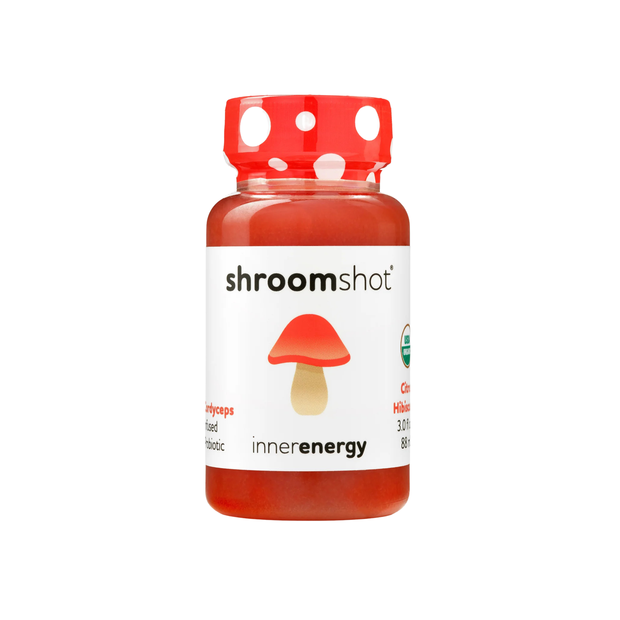 Energy: Experience a natural boost of energy with Inner Energy, a citrus-hibiscus flavored wellness shot infused with the power of adaptogenic cordyceps mushroom and a touch of caffeine from green tea. Crafted to enhance endurance and vitality, this potent blend helps you power through your day with sustained, all-natural energy. Enjoy the refreshing, fruity taste while fueling your body and mind—Inner Energy is your go-to boost for lasting vitality! Features: - 3oz ready-to-drink bottles - Case of 12 shots - 120-day shelf life - Made w/ only certified Organic ingredients - Includes eye-catching shelf card with opening orders + table top display upon request - Contains cordyceps mushroom and caffeine from green tea - Living probiotics for gut health
