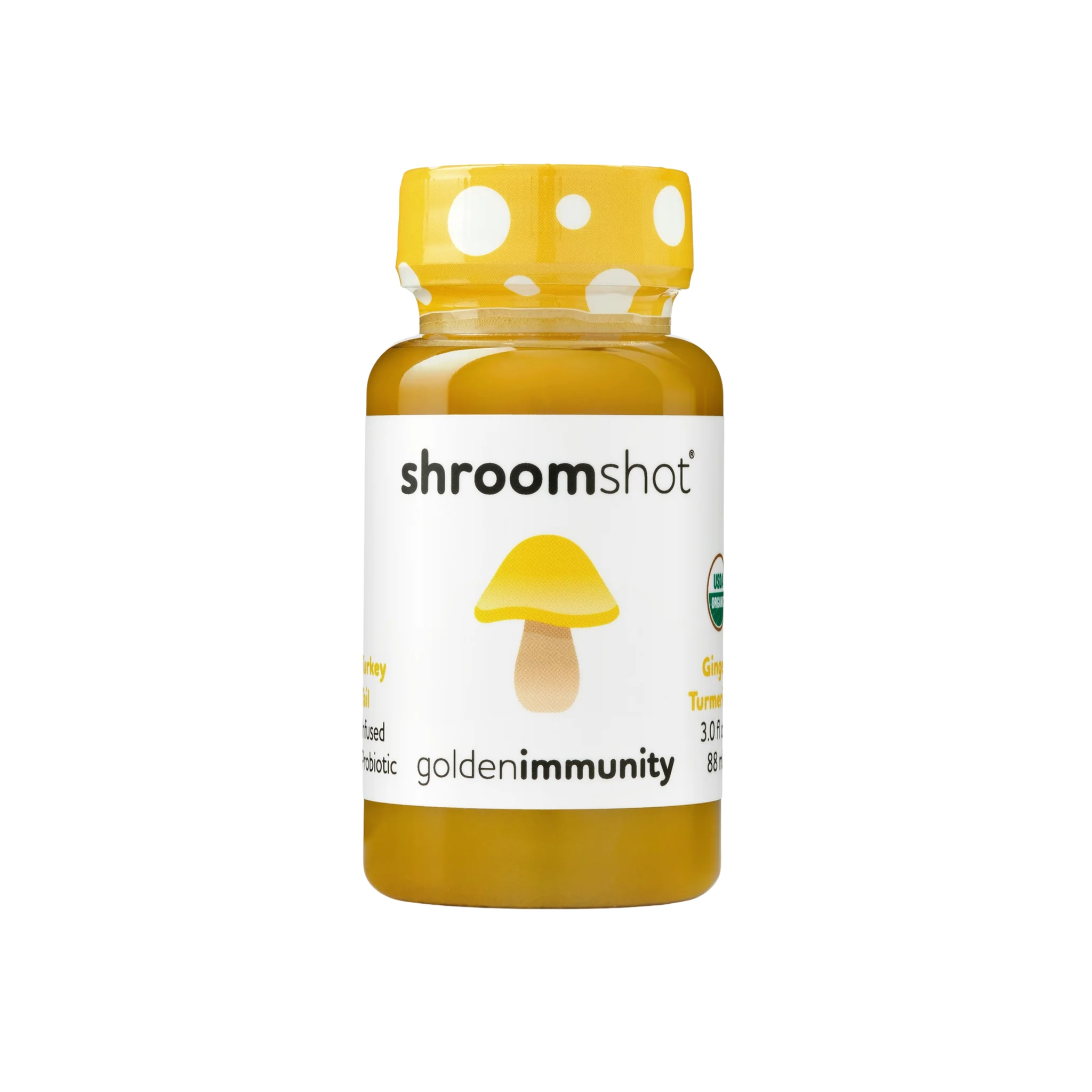 Immunity: Fortify your immune system with our Golden Immunity wellness shot! This delicious, ginger, turmeric, and pineapple flavored shot contains turkey tail mushroom, a powerful immune support adaptogen. We pair this with living probiotics from kombucha. Golden Immunity is a great way to boost your immunity and help your body fight off illness. Try it today and let your immune system shine! Features: - 3oz ready-to-drink bottles - Case of 12 shots - 120-day shelf life - Made w/ certified Organic ingredients - Includes eye-catching shelf card with opening orders + table top display upon request - Contains Turkey Tail mushroom and ginger/turmeric - Living probiotics for gut health